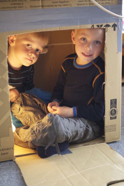 Vi fant fort ut at kun leik ikke fungerte. Det ble bråk , uro og uenigheter om hvem som skulle bo hvor. Husene var for få og for små- foreløpig. Vi penset dem raskt inn i leik/arbeid og hentet inn flere store esker/hus.